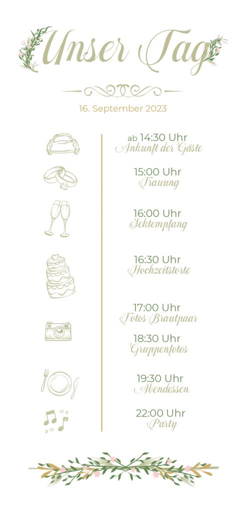 Der grobe Tagesablauf steht bereits. Die Zeiten sind ungefähre Richtwerte, außer der Start. Bitte findet euch ab 14:30 Uhr im Marcolinis ein, damit wir pünktlich 15 Uhr mit der Trauung beginnen können (sofern Chris rechtzeitig gestylt ist 😜)